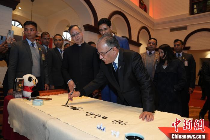 当地时间1月14日晚,2024年“春之声·金梦想”跨国新春文艺晚会暨中国春节招待会、中国新年系列庆祝活动启动仪式在尼泊尔首都加德满都举行,上演了一场跨越雪山、携手迎春的文化盛宴。图为尼泊尔总理普拉昌达体验中国书法。云南省人民政府新闻办公室供图