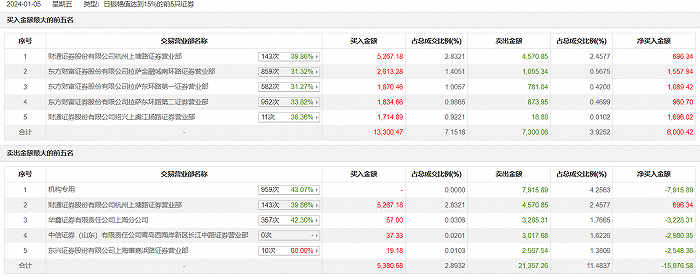 日久光电1月5日涨停,全天换手率达50.56%,振幅达20.05%。龙虎榜数据显示,营业部席位合计净卖出1.07亿元。其中,机构合计净卖出7915.89万元。此外,财通证券杭州上塘路证券营业部、东方财富证券拉萨金融城南环路证券营业部分别买入5267.18万元、2613.28万元;财通证券杭州上塘路证券营业部、华鑫证券上海分公司分别卖出4570.85万元、3285.31万元。