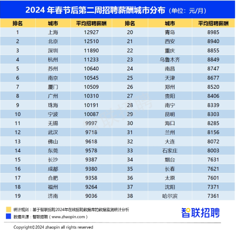 统计显示,春节后第二周,上海、北京、深圳、杭州、苏州五大城市,继续稳居平均招聘薪酬榜前五。其中,上海以12927元/月排名第一,北京、深圳、杭州、苏州平均招聘薪酬分别为12510元/月、11890元/月、11233元/月、10640元/月。